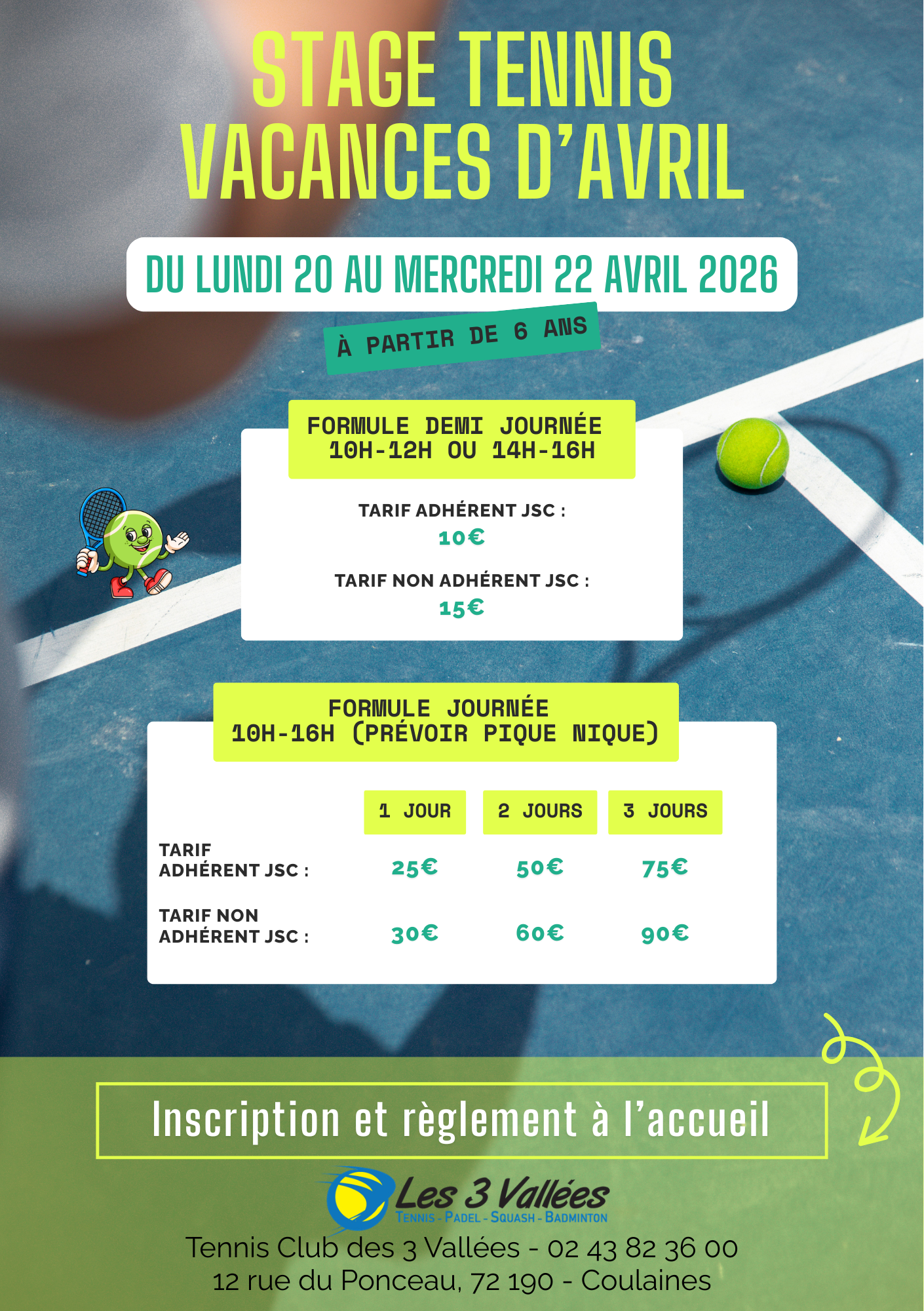 La section Tennis de notre club vous propose un stage pendant les vacances d'avril 2026 !